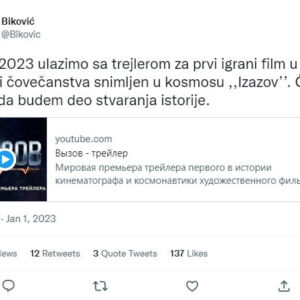 “У 1.1.2023 улазимо са трејлером за први играни филм у историји човечанства снимљен у космосу “Изазов”. Част ми је да будем део стварања историје.”