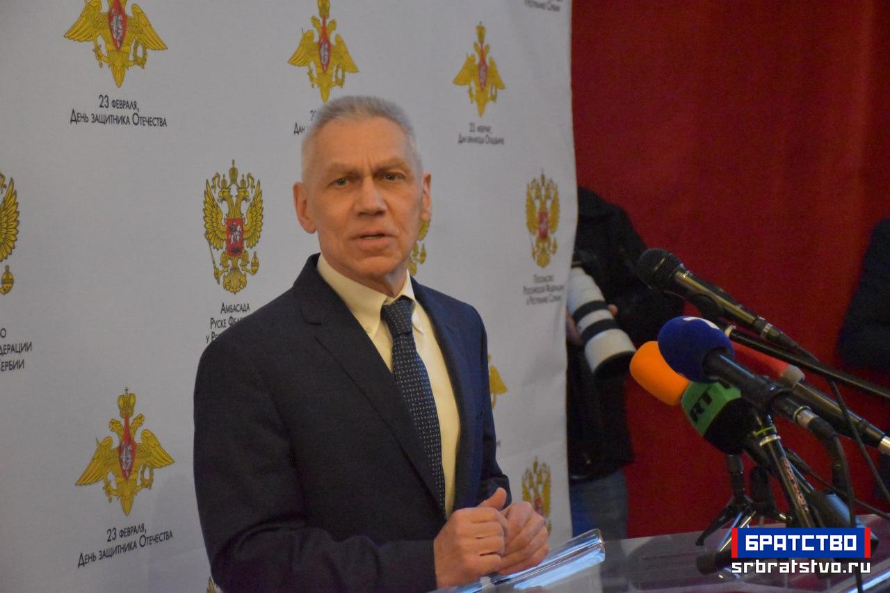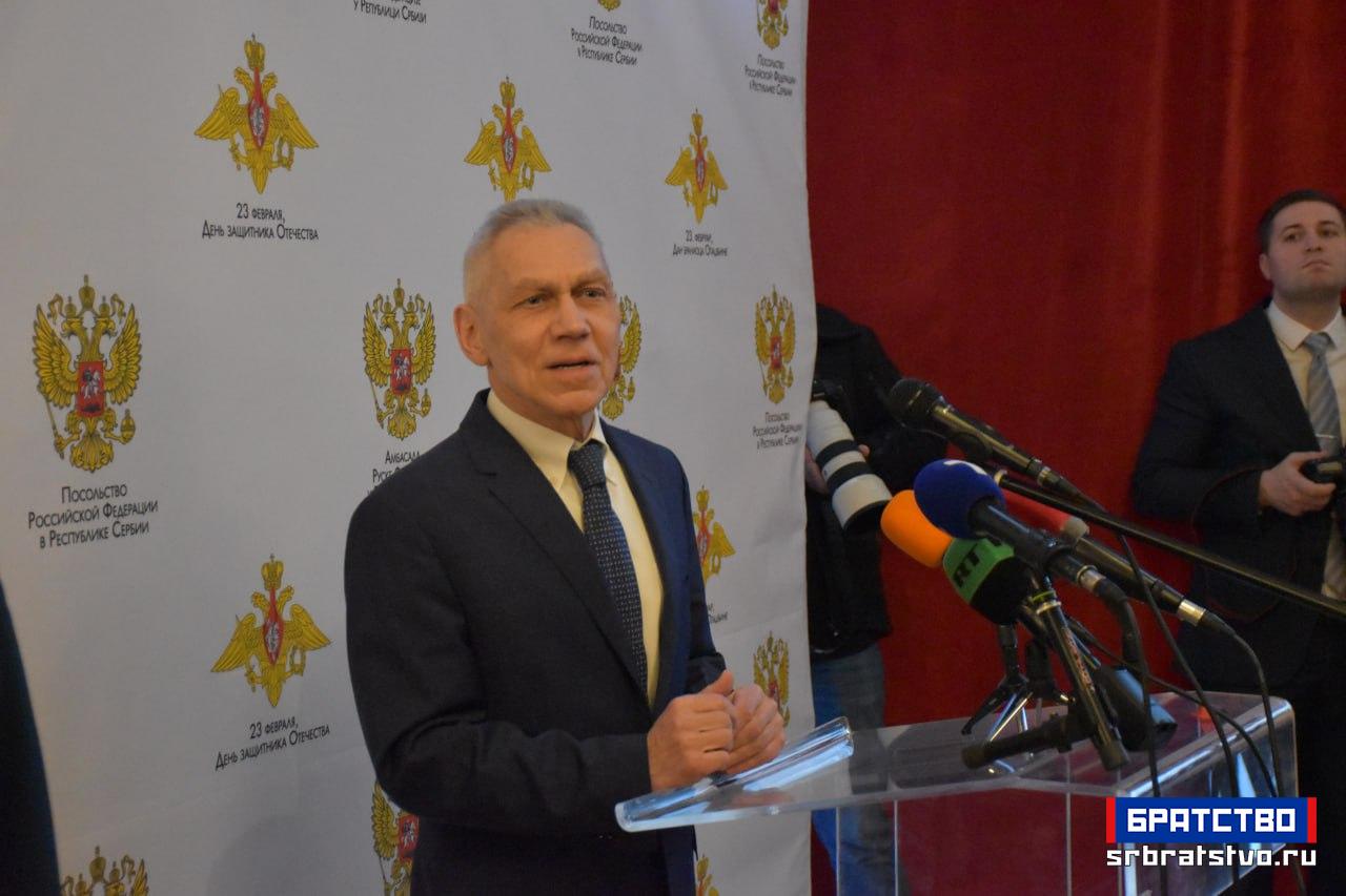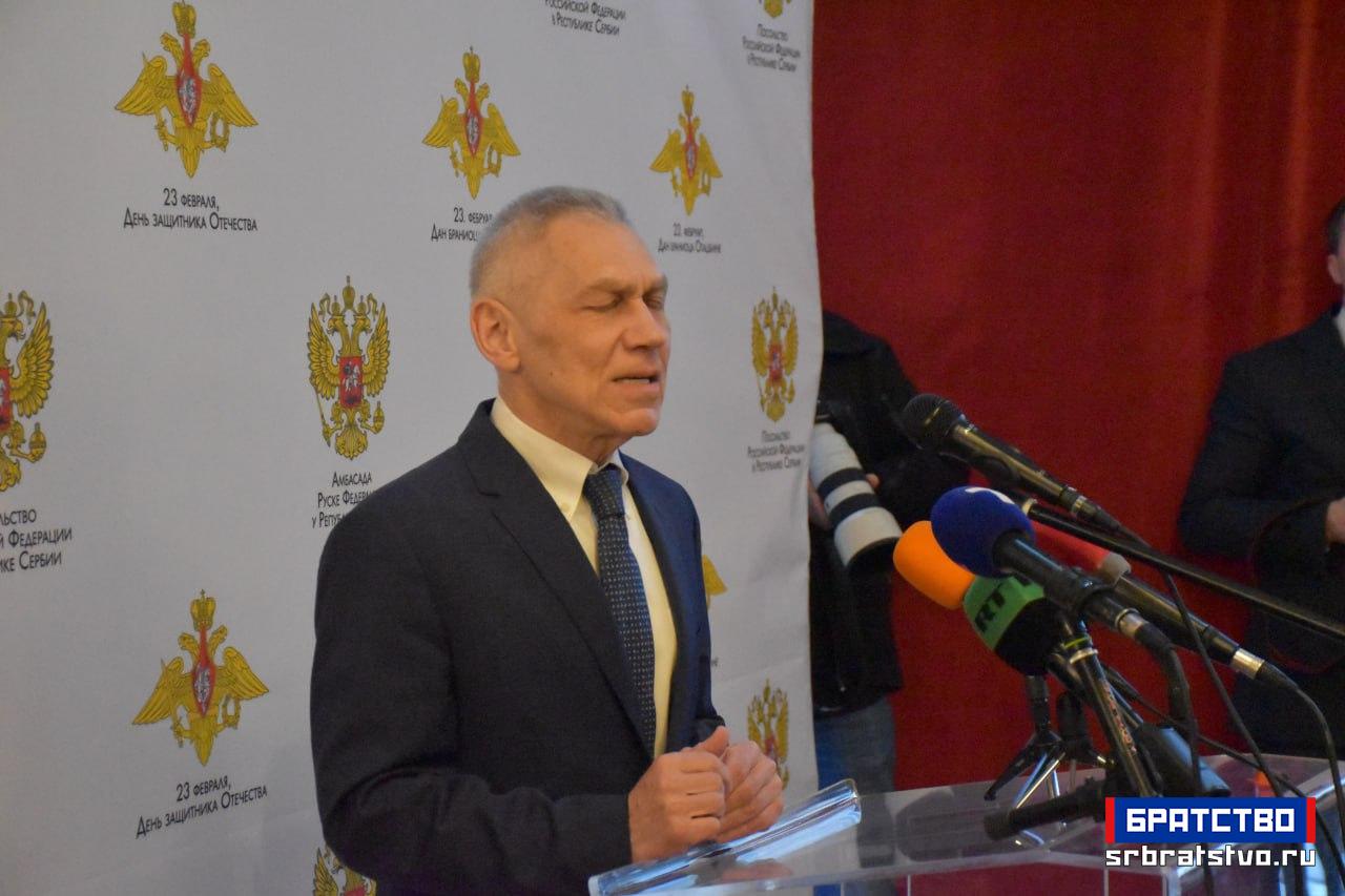 „На крају желим да честитам припадницима Војске Руске Федерације, пре свега је ово њихов празник, а они бране суверенитет, национални интерес и безбедност руске федерације, наше државе, и пре свега онима који се налазе на терену специјалне војне операције – њима, војницима и цивилима, а исто тако и радницима који су радили и сада раде у три-четири смене, да војници увек добију све што је неопходно.“ У реалности днашњег света, закључио је амбасадор, „ако се назире нешто охрабрујуће, нешто позитивно, то је пре свега захваљујући храбрости и напорима руских војника и људи Донбаса. Њима још једном хвала и хвала вама што сте дошли у таквом броју и на таквом нивоу.“