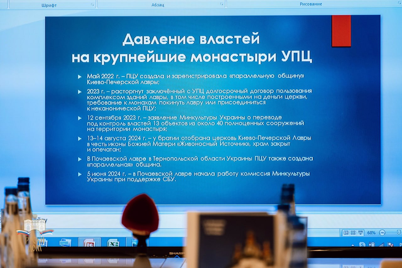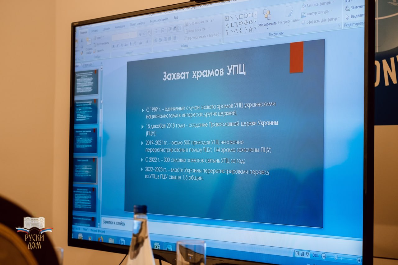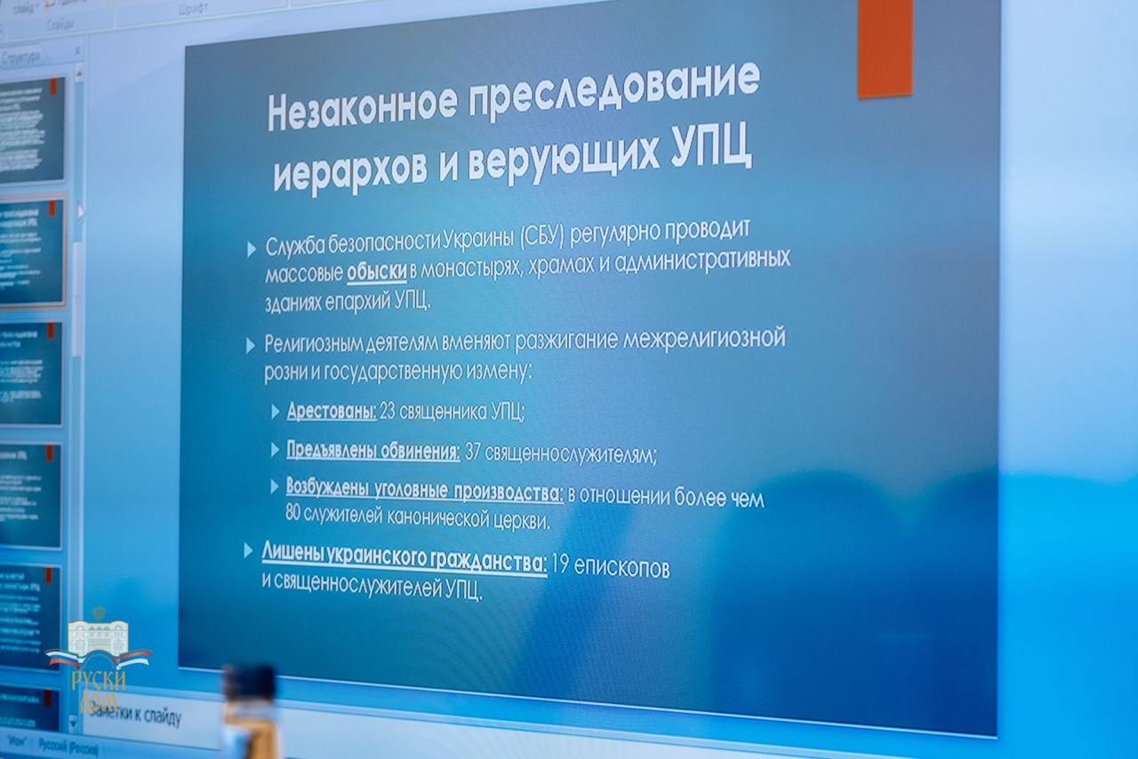Руслан Калинчук је поделио са учесницима округлог стола своје искуство изласка из дискриминаторског утицаја локалних власти у Украјини због свог ангажовања у Украјинској Православној Цркви, а такође је изнео актуелне податке о резултатима политике која се спроводи у земљи ради уништавања канонске Цркве. Упркос раду који спроводи Државна служба за етнополитику и статистици коју је јавно представило њено руководство о присилној предаји скоро 2.000 храмова УПЦ такозваној „ПЦУ“, украјински верници остају привржени канонској Цркви и настављају да обављају богослужења изван храмова.