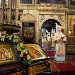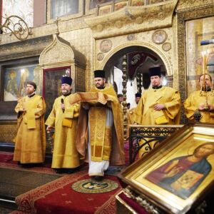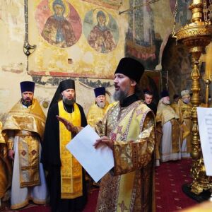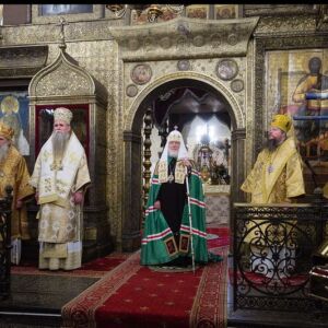 Да прије свега заблагодарим на вашој љубави, на вашем очинском срцу што сте данас благоизволили и благословили да саслужујемо на овој Божанственој литургији, на празник Московских Светих, у овом предивном катедралном храму руских Патријараха.