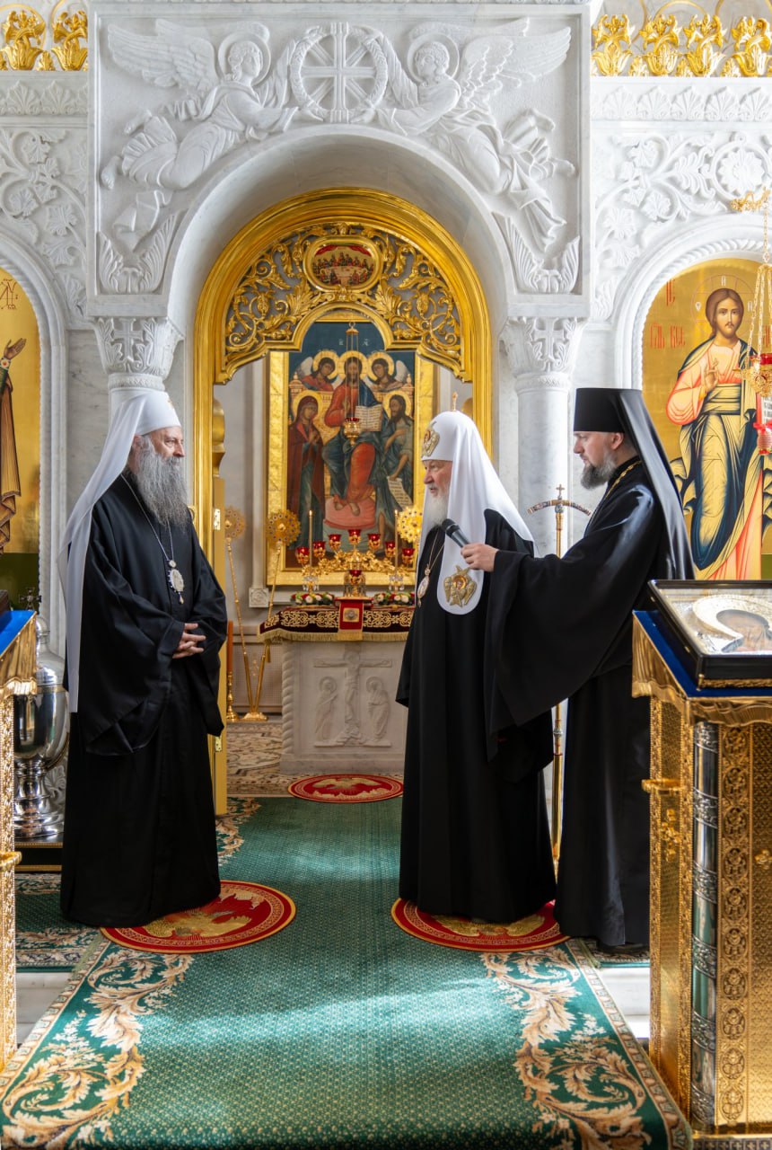 Пре састанка, Предстојатељи двеју Цркава посетили су домаћи храм Патријаршке резиденције. Поздрављајући високог госта са топлином и осећањем братске солидарности, Његова Светост Патријарх Кирил је истакао да Руска Црква никада није имала ни летећу сенку било чега негативног у односима са Српском Црквом, већ да су се међусобно разумевање, љубав и братска подршка увек одржавали. „То није случајно: не само да су наши народи блиски по језику, култури и историји, већ су и обе наше Цркве током своје историје много страдале, укључујући и као резултат неправедних прогона у 20. веку“, наставио је Његова Светост. — И историјско искуство које долази из дубина векова и искуство прошлог века уједињују наше Цркве, укључујући и њихово разумевање онога што пастирска мисија усмерена на савременог човека данас треба да буде. Иако више нема прогона каквих је било у тоталитарним режимима, извесну опасност представља и оно што се данас дешава на пресеку црквеног и световног живота. Људи се суочавају са лажним идеалима, лажним постављањем циљева, повезаним са постизањем високог нивоа удобности и материјалног благостања. Истовремено, духовне и моралне вредности повезане са хришћанством често се померају на периферију. Стога је заједнички мисионарски и богословски рад наших братских Цркава данас веома потребан.”