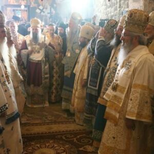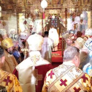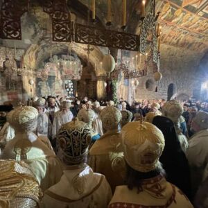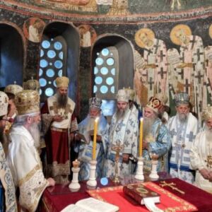 Његова Светост Патријарх српски г. Порфирије началствовао је светом Литургијом у древном манастиру Пећкој Патријаршији уз саслужење Његовог Блаженства Архиепископа охридског и Митрополита скопског Jована; високопреосвећених митрополита дабробосанског Хризостома, црногорско-приморског Jоаникија, будимпештанског и мађарског Илариона из Московске Патријаршије и преспанско-пелагонијског Петра из Македонске Православне Цркве – Охридске Архиепископије; преосвећене господе епископа сремског Василија, будимског Лукијана, бачког Иринеја, жичког Јустина, врањског Пахомија, шумадијског Јована, зворничко-тузланског Фотија, милешевског Атанасија, диселдорфског и немачког Григорија, рашко-призренског Теодосија, западноамеричког Максима, горњокарловачког Герасима, источноамеричког Иринеја, крушевачког Давида, славонског Јована, аустријско-швајцарског Андреја, нишког Арсенија, далматинског Никодима, осечкопољског и барањског Херувима, ваљевског Исихија, шабачког Јеротеја, западноевропског Јустина, стобијског Давида, ремезијанског Стефана, мохачког Дамаскина, марчанског Саве, брегалничког Марка.