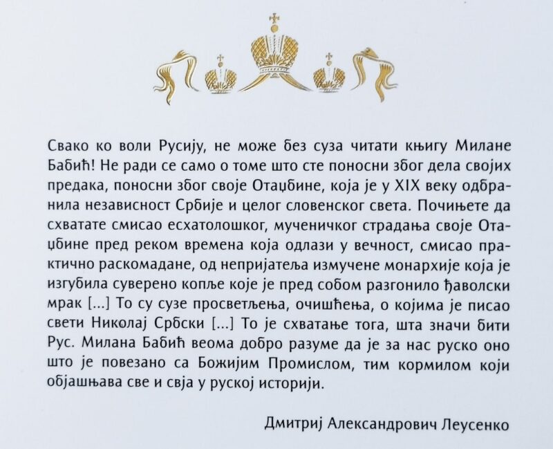 И данас Русија представља главног гаранта и заштитника како Републике Српске, тако и опстанка Косова и Метохије у окриљу србске државности. Од Светог Саве па до данашњих дана није било ни једног историјског моментума када су геополитички интереси Руса и Срба били супротстављени. Било је само политичких идиота на једној или на другој страни. Чак и у време блоковске поделе света, свакако да у окриљу Варшавског пакта не би било могућно такво разарање србског националног бића какво је чињено у прозападној брозоморији. Тако да је и данас заговарање евроатланског пута и сврставање у антируски миље, могућно само у главама англосаксонских шпијуна или политичких идиота. Све то и много више, између редова ћете открити у сјаном диптиху Милане Бабић, који Вам од срца препоручујемо.