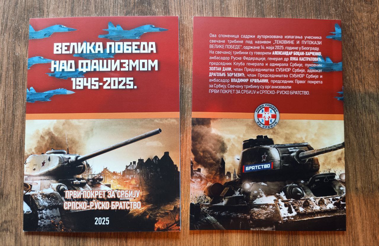 У издању Српско-руског Братства објављена је споменица „Велика Победа над фашизмом 1945-2025.“ која садржи ауторизована излагања учесника свечане трибине под називом „Тековине и путокази Велике Победе“, одржане 14. маја 2025. године у Београду. Свечану трибину су организовали Први покрет за Србију и Српско-руско Братство. На трибини су говорили: Александар Боцан-Харченко, амбасадор Руске Федерације, амбасадор Владимир Кршљанин, председник Првог покрета за Србију, генерал др Лука Кастратовић, председник Клуба генерала и адмирала Србије, пуковник Золтан Дани, члан Председништва СУБНОР Србије, и адвокат Драгољуб Ђорђевић, члан Председништва СУБНОР Србије.
