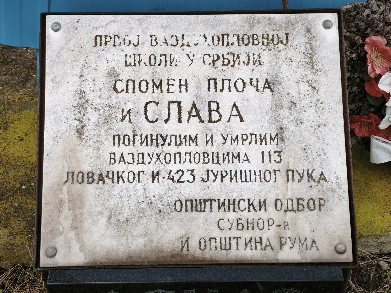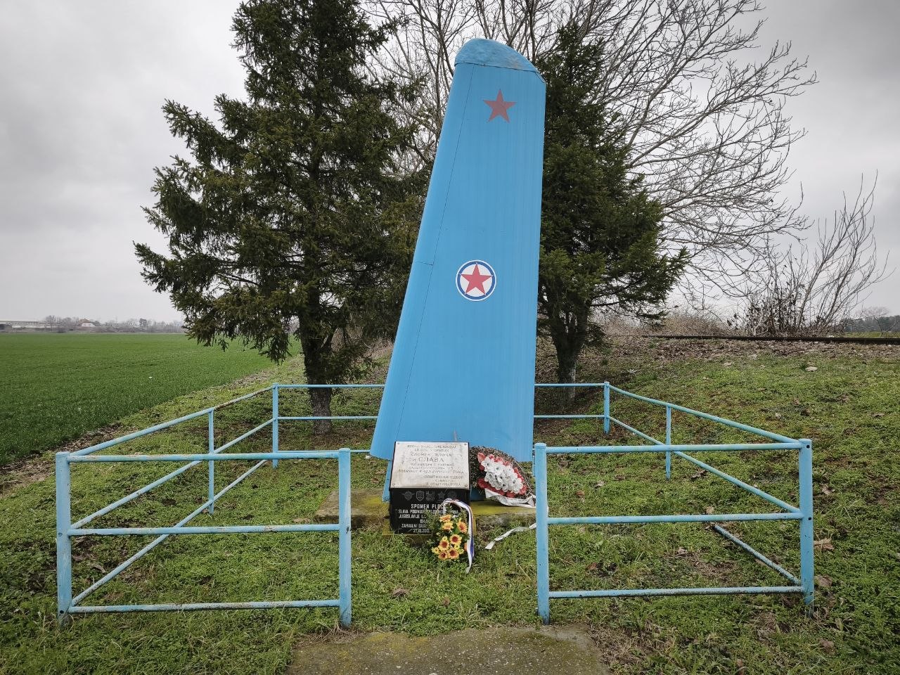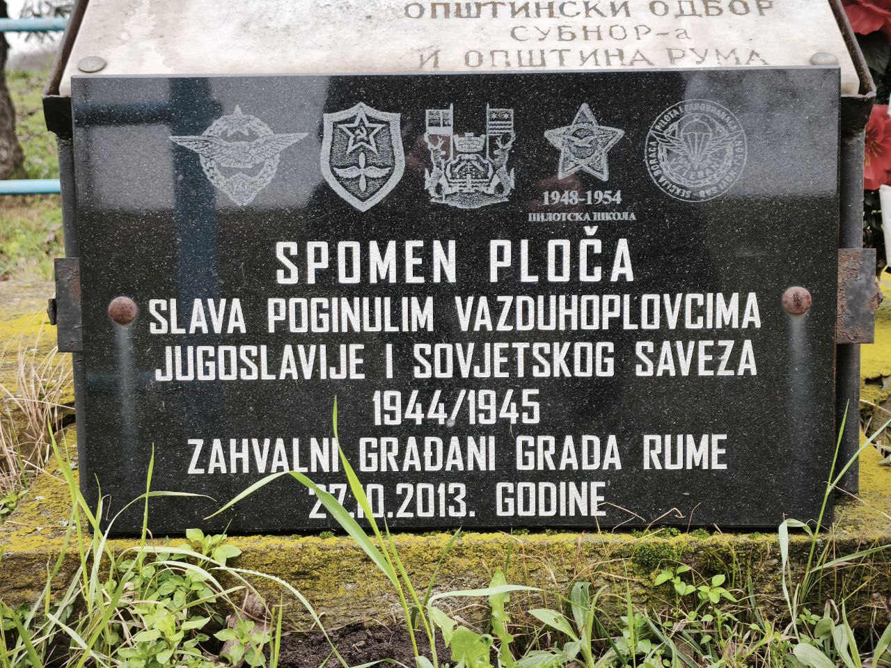 На излазу из Руме, у непосредној близини железничке пруге и пољопривредних површина које се пружају дуж саобраћајнице, уз главни правац ка аутопуту Београд-Загреб, налази се спомен обележје у облику усправљеног авионског крила са црвеном звездом. Постављено на уређеној парцели ограђеној металном оградом, ово обележје јасно указује на војноисторијски значај овог места.