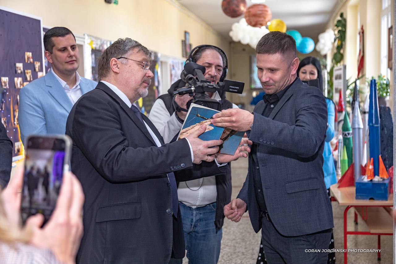 Амбасада је предала више експоната у збирку школског музеја, укључујући и књигу са аутограмом Јурија Гагарина.