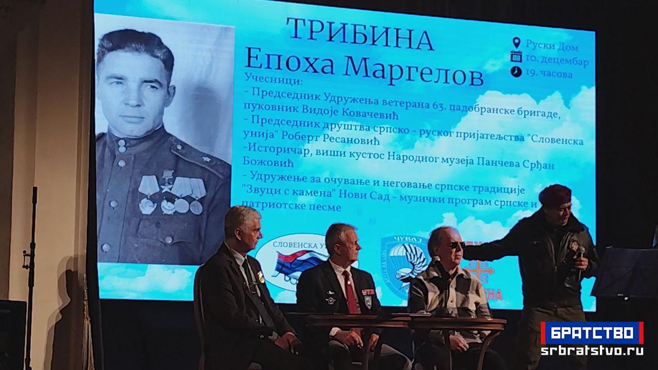 Трибина посвећена 116. годишњици рођења команданта Ваздушно-десантних снага Русије, генерала армије и хероја Совјетског Савеза Василија Филиповича Маргелова, одржана је синоћ у препуној великој сали „Фјодор Шаљапин“ Руског дома у Београду.