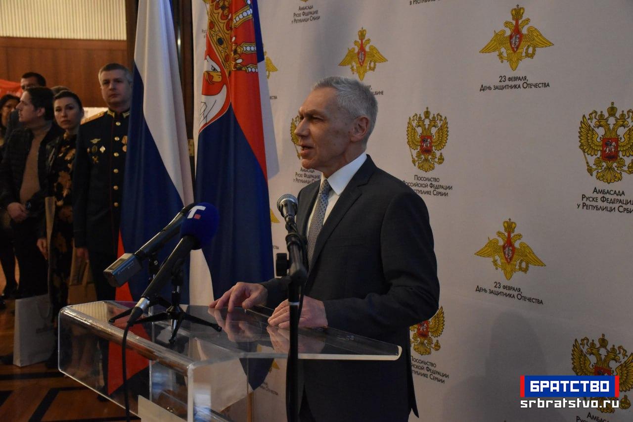 У руској амбасади у Београду данас је одржан пријем поводом 23. фебруара, Дана браниоца отаџбине. Традиционално, домаћини на пријему поводом овог празника су заједно амбасадор Александар Боцан-Харченко и изасланик одбране генерал-мајор Андреј Киндјаков.